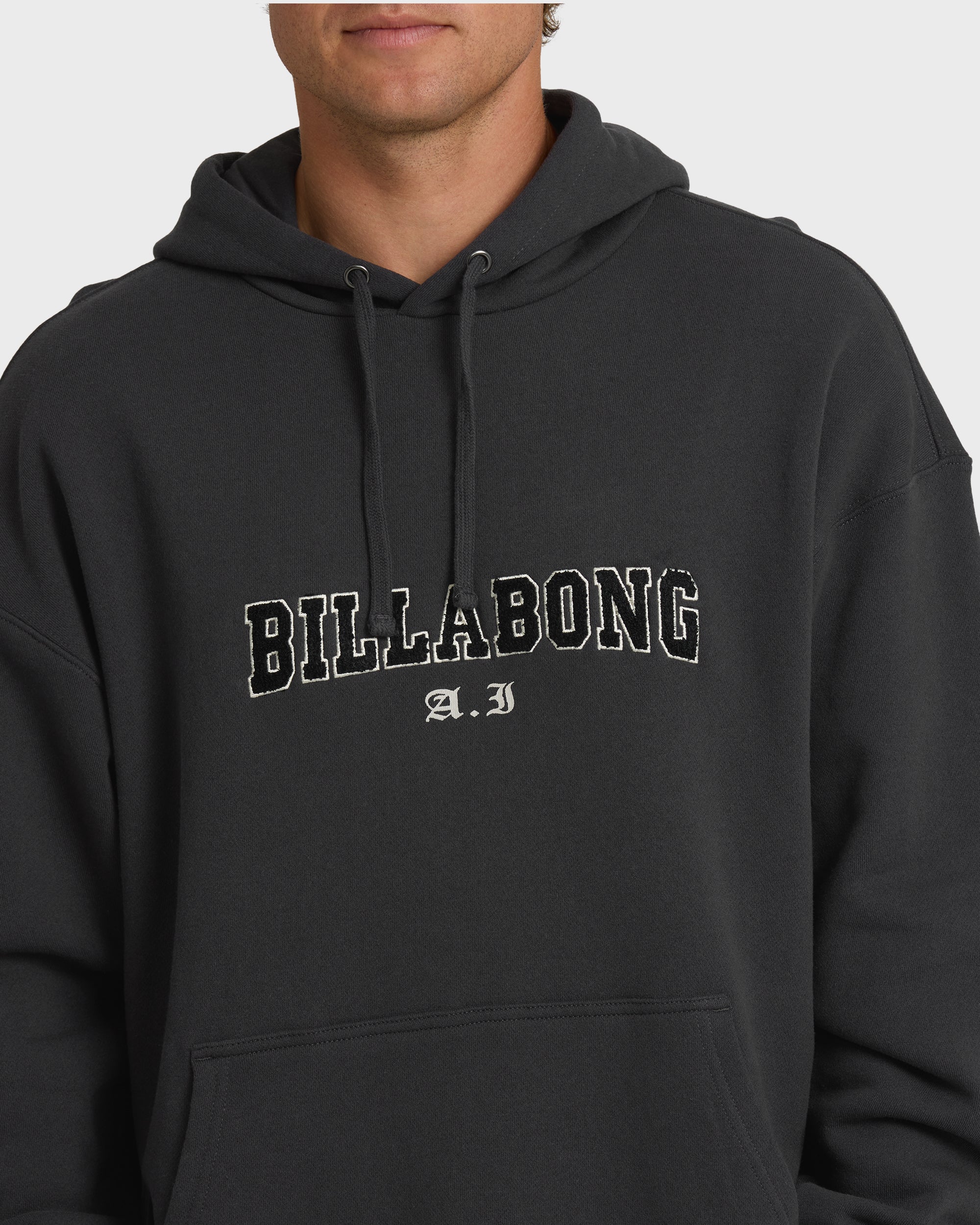 Stay cozy in our long sleeve hooded pullover fleece with signature screenprints front and back. The regular fit and soft cotton-poly blend keep things comfortable, while the kangaroo pocket holds essentials. Finished with A.I. signature woven labels for authentic style.