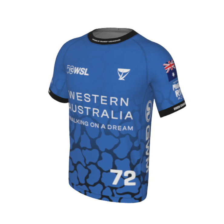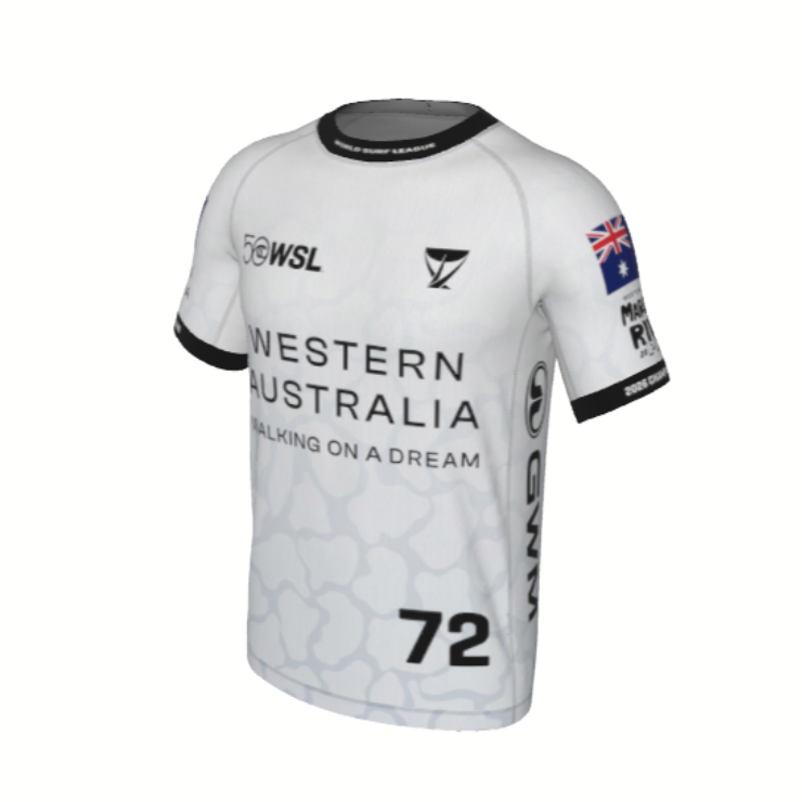 - Front graphic: WSL 50 anniversary logo, Championship Tour emblem and the 2026 WA Margaret River Pro Logo