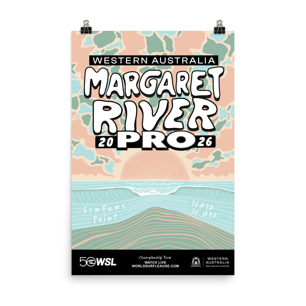 Official merchandise from the 2026 Western Australia Margaret River Pro. This poster has a partly glossy, partly matte finish.