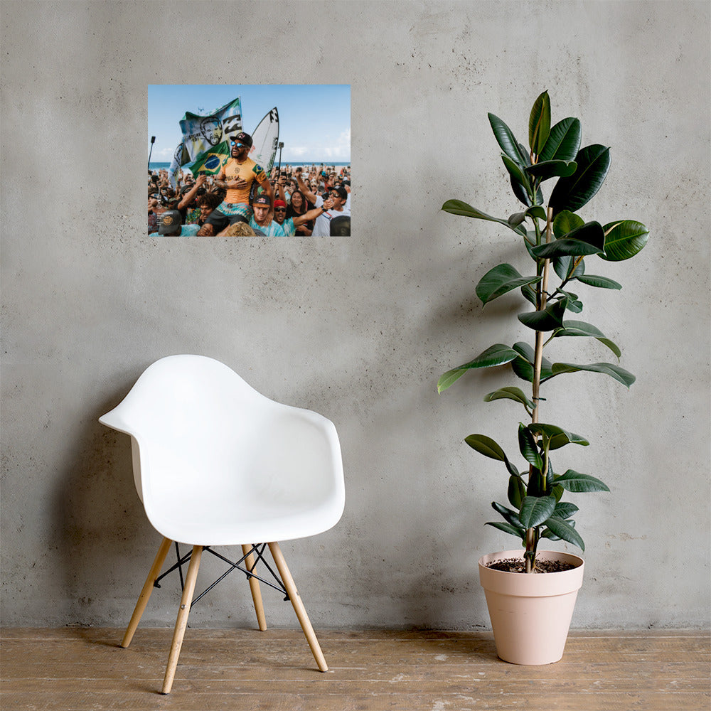 Italo Ferreira no Billabong Pipe Masters 2019. Este pôster de 18" x 24" tem um acabamento parcialmente brilhante e parcialmente fosco.